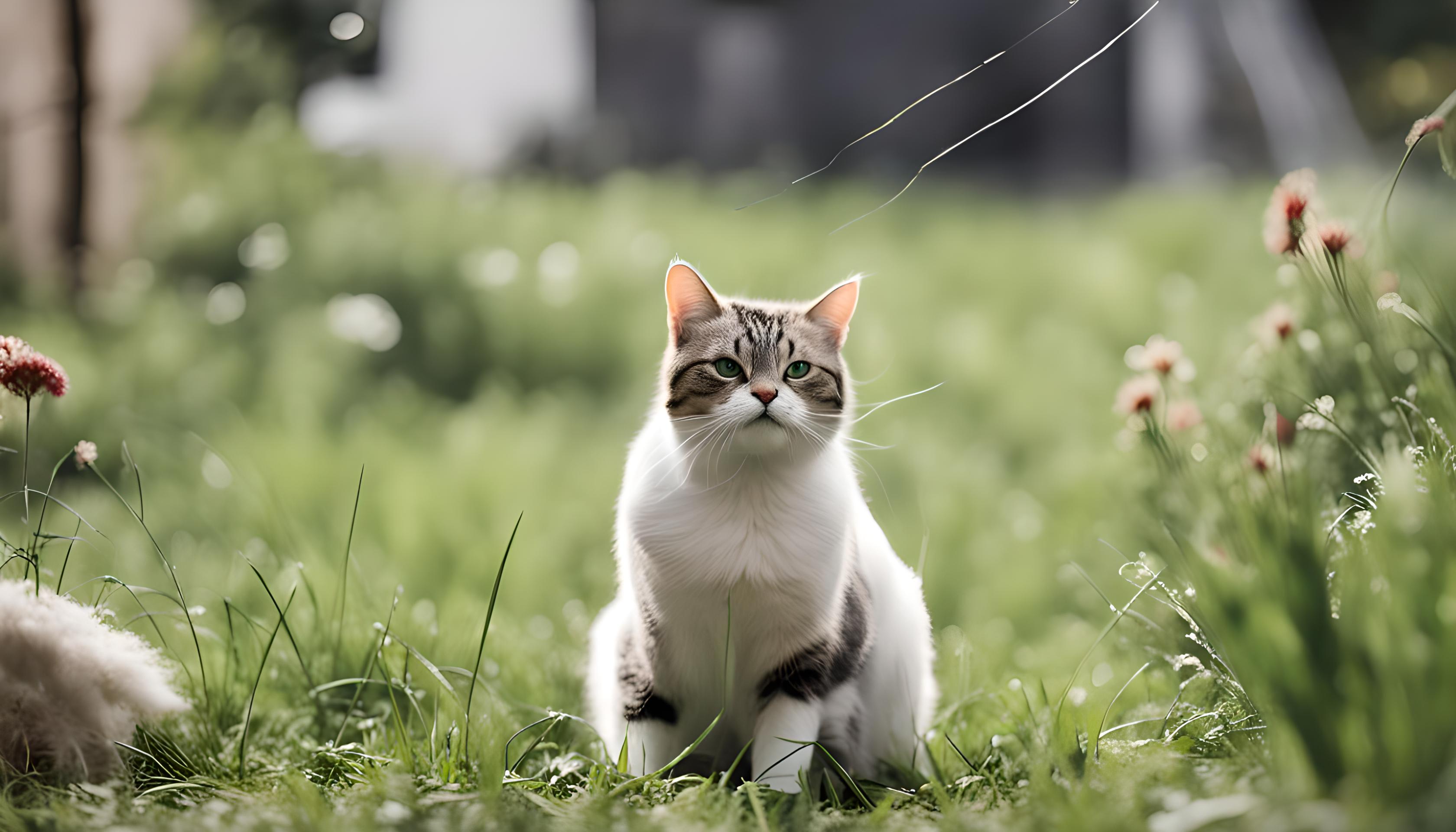 Enjoying a peaceful moment in nature, this curious feline explores the wonders of the grass.