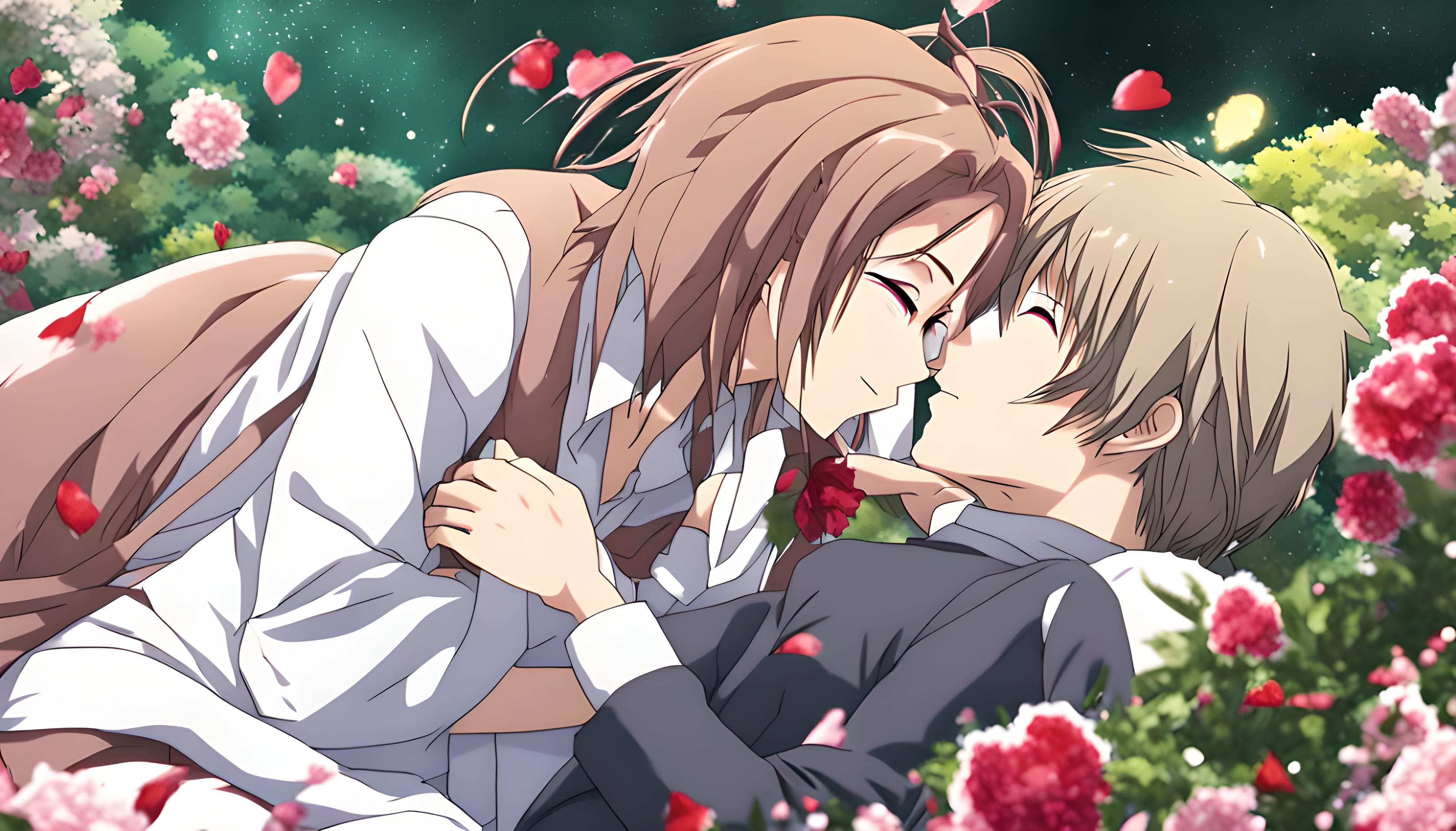 In this beautiful moment captured, love blooms like the flowers that surround them. A kiss is not just an expression, but a connection that transcends words.