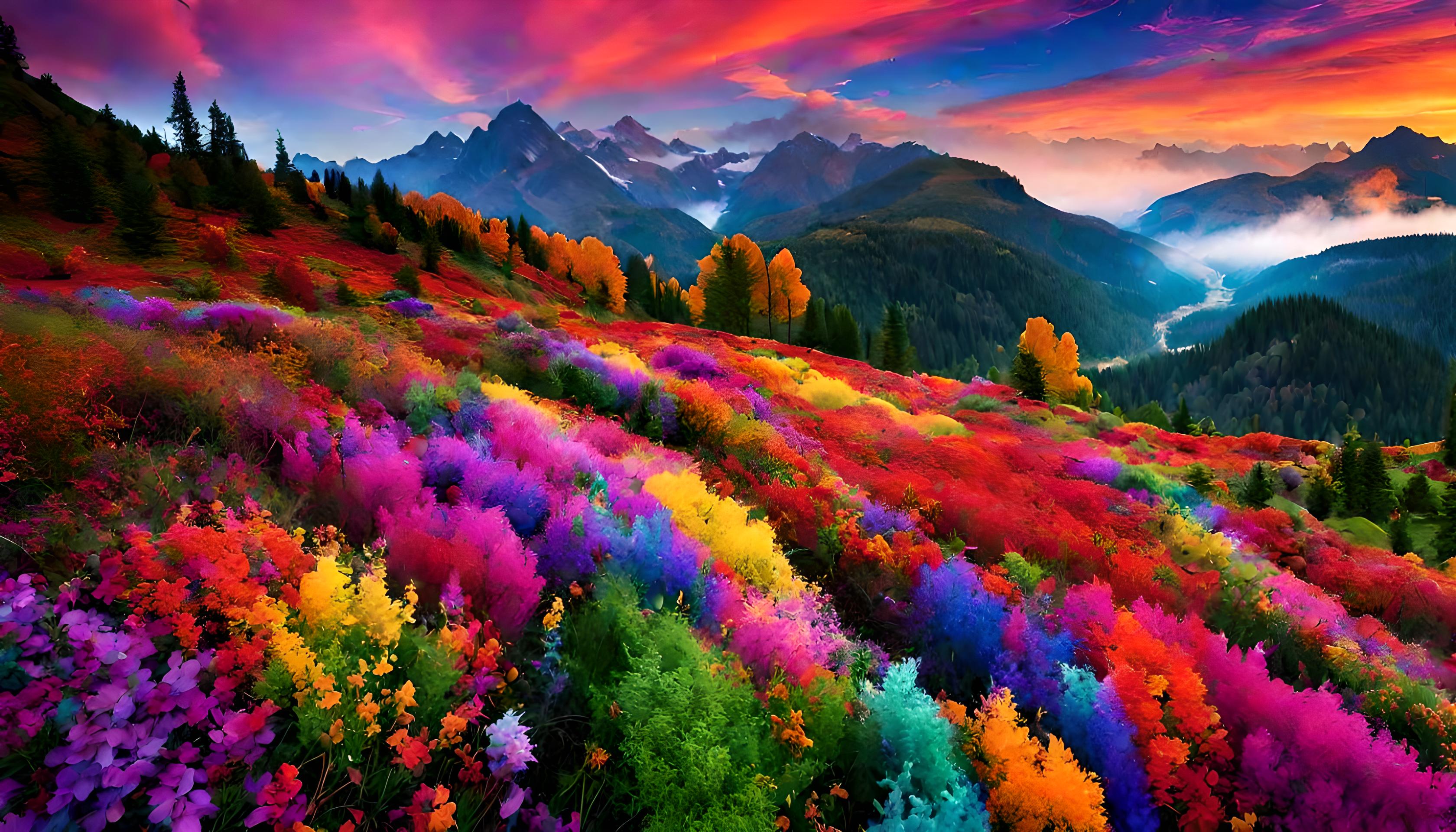 Embrace the tranquility of nature as vibrant hues paint the landscape, merging mountains and trees in perfect harmony. A reminder of the beauty that surrounds us at every sunrise and sunset.
