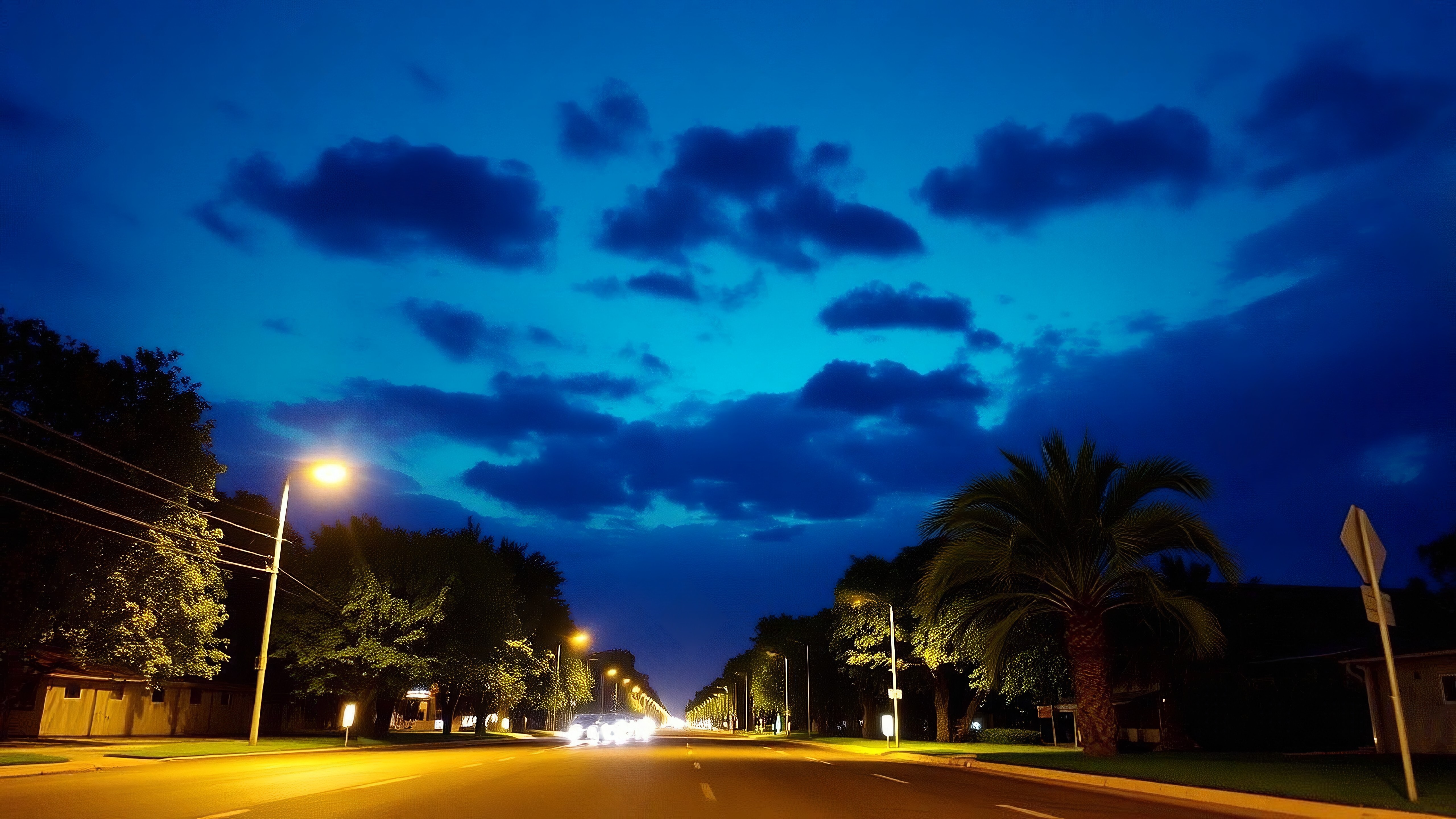 Under the glow of streetlights, palm trees sway gently in the night breeze. There's something magical about this serene road as the sky transforms at sunset.
