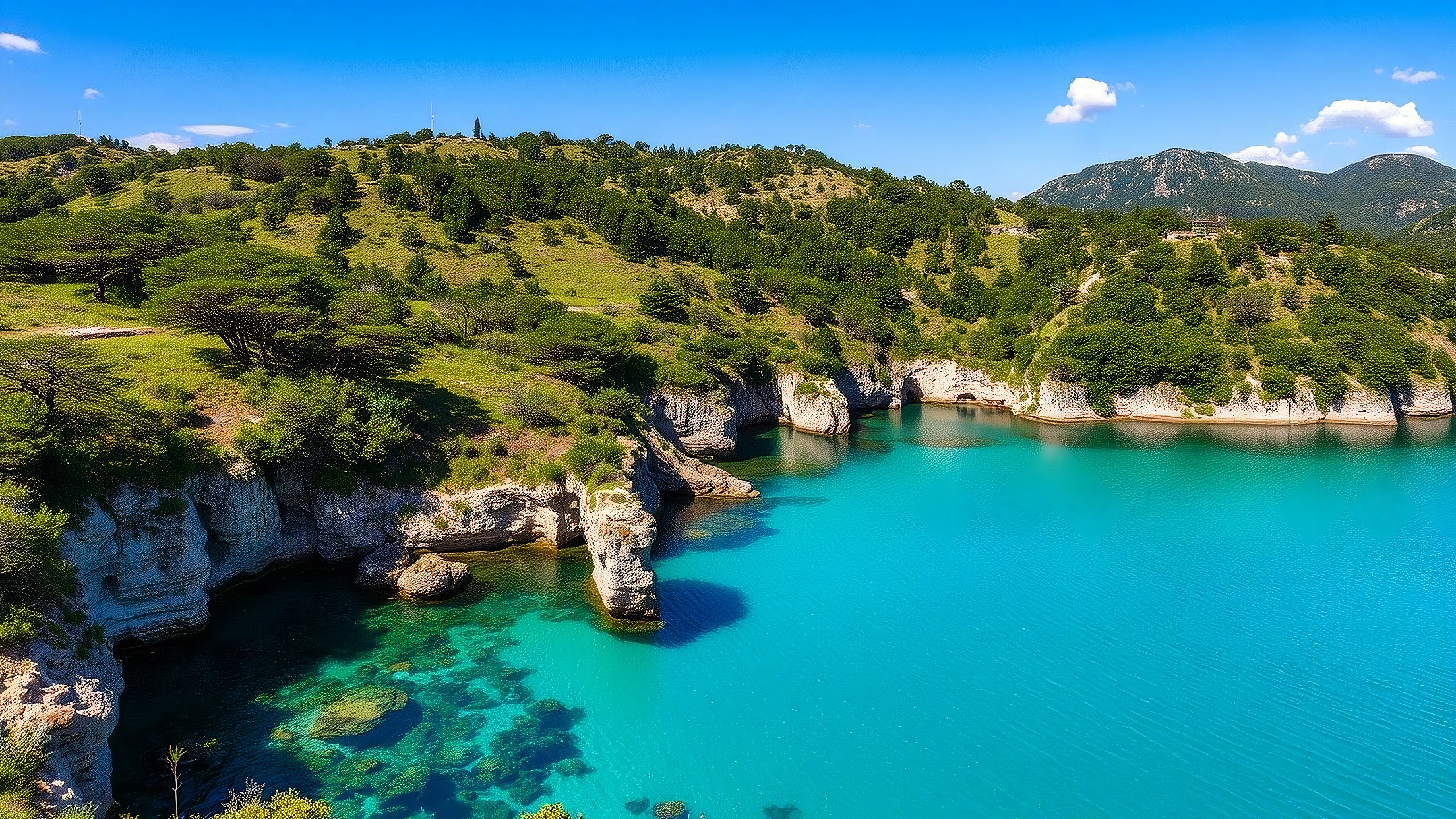 Nature's masterpiece Embrace the serenity of this beautiful body of water surrounded by lush trees and rugged rocks. Perfect for a day of adventure or peaceful reflection.